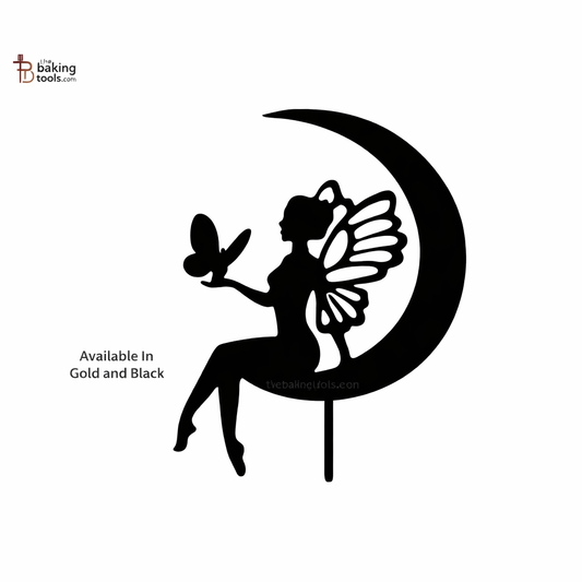 Fairy Holds Butterfly On Moon Acrylic Cake Topper (Gold & Black) MD-17 - thebakingtools.com