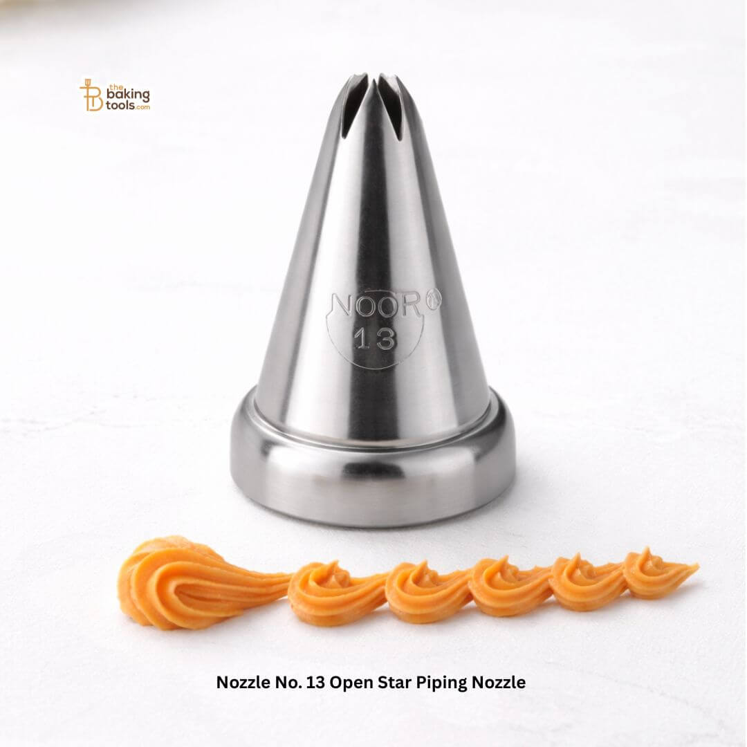 The Nozzle No. 13 Open Star Piping Tip is perfect for making star swirls, shell borders, and textured cream designs. It gives sharp ridges and clean patterns that make your cakes look professional.